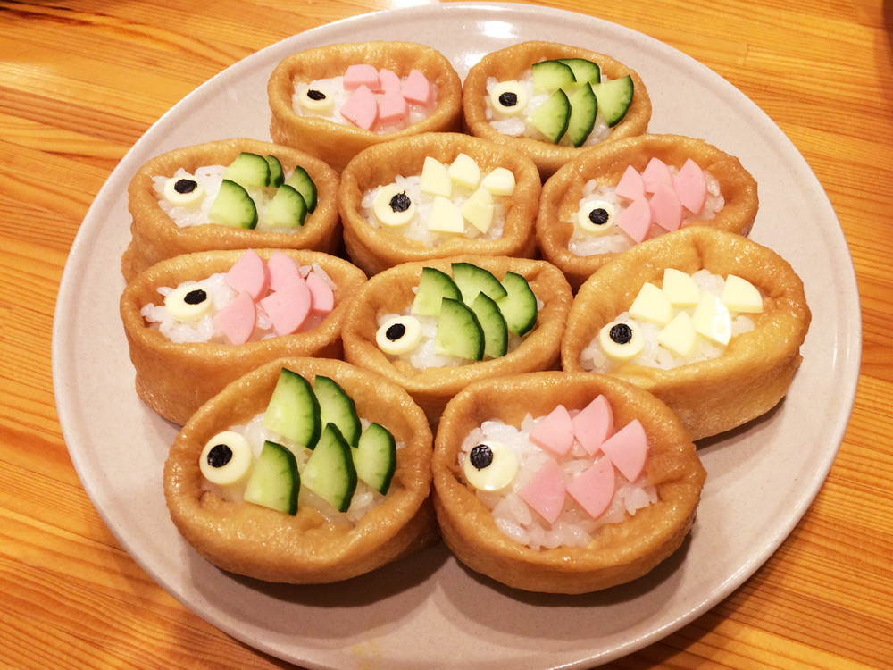 いつも作るいなり寿司と同じ手順ですが、最後にいなりを閉じずそこにこいのぼりを飾ります。食べるのがもったいないですね!